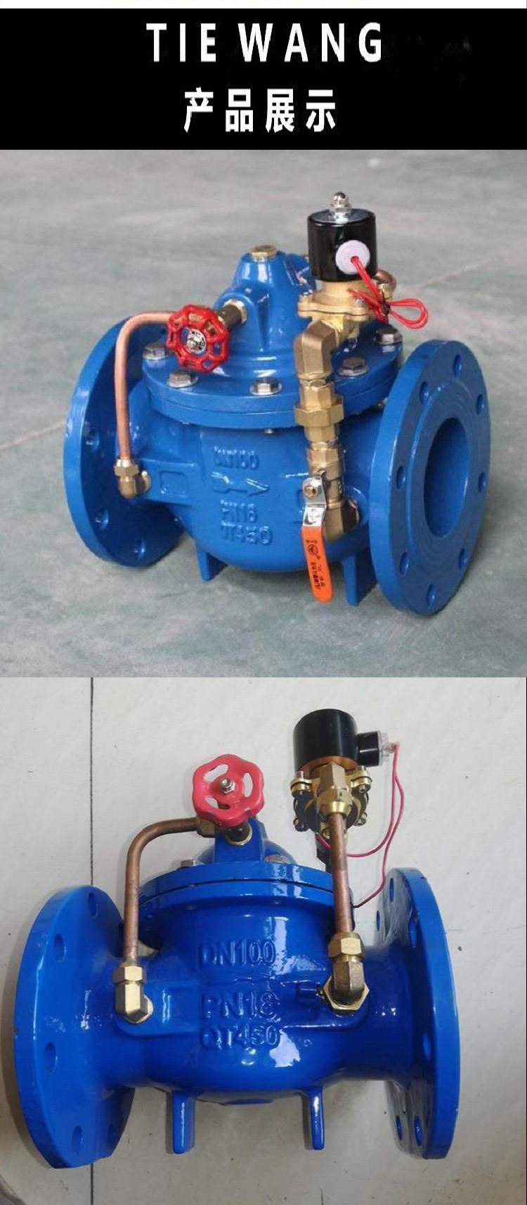 600X电动控制阀由主阀、电磁导阀、针阀、球阀、微形过滤器和压力表组成水力控制接管系统。通过电磁导阀可以实现对阀门开启和关闭的遥控。加装附加装置后,可控制开启和关闭的速度。电控水力控制阀利用导阀控制阀门的开启和关闭,节省能源。可代替其它阀门大型电动装置。电控水力控制阀产品用于高层建筑、生活区等供水管网系统及城市供水工程。600X电动控制阀是一种以电磁阀为向导阀的水力操作式阀门。常用于给排水及工业系统中的自动控制,控制反应准确快速,根据电信号遥控开启和关闭管路系统,实现远程操作。600X电动控制阀可取代闸阀和蝶阀用于大型电动操作系统。阀门关闭速度可调,平稳关闭而不产生压力波动。该阀门体积小、重量轻、维修简单、使用方便.电磁阀可选用交流电220V,或直流电24V,可根据场合选用常开或常闭型均可。
