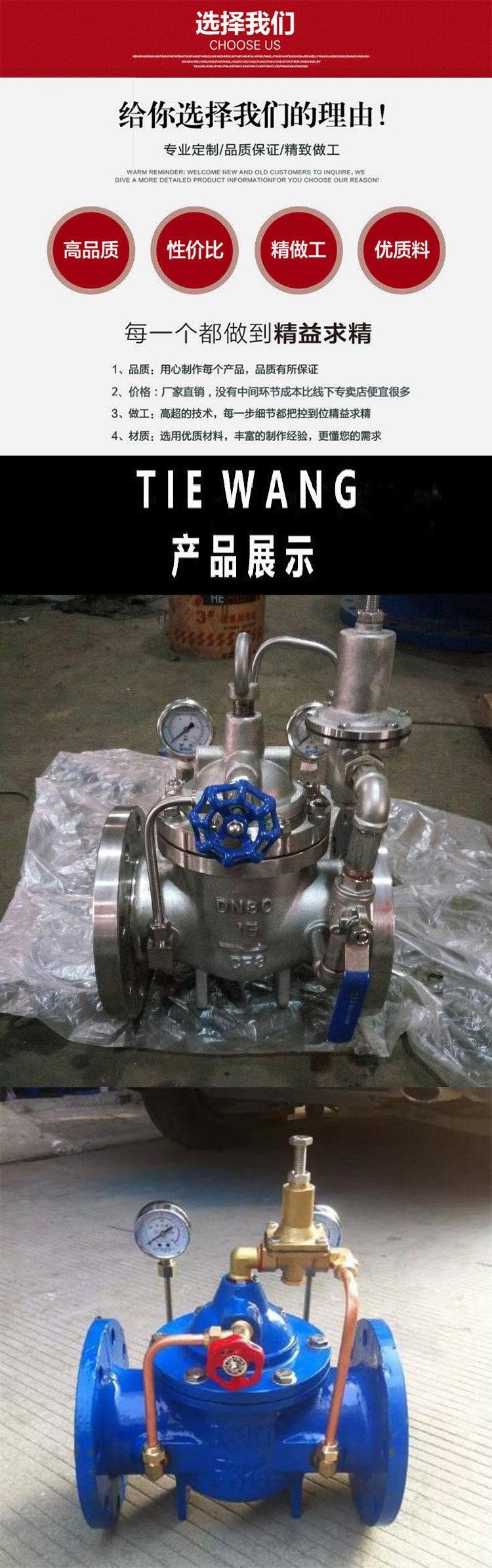 800X压差调节阀由主阀、压差控制导阀、针阀、球阀、微形过滤器和压力表组成水力控制接管系统。通过设计的导阀控制室,对压力变化信号进行比较,输出主阀开度信号,控制主阀开度,从而控制主阀的进出口压差在设定值上。本产品利用水力自力控制,不需要其它装置和能源,保养简便。本系列阀门产品用于高层建筑、生活区等供水管网系统及城市供水工程。