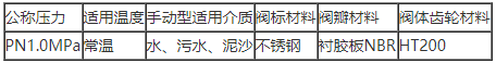 SD44X手动排泥阀主要由主阀、齿轮箱、具轮手柄、档位等组成,工作时只要把手柄往下按定位就可以开启,相反就快速关闭。其寿命达两年以上,开启速度快,一般 在5秒钟内阀板已全开,阀板与阀体为软密封,关闭后密封性能好,无渗漏,以便维修更换,如配以电磁换向阀指控 液压缸,则能实现远控、自控等。若配手动装 置,可以4-12台一排安装,同时起动关闭,驱动压力取于水厂本身,无需另加设备,可省人力物力,节约能源 。